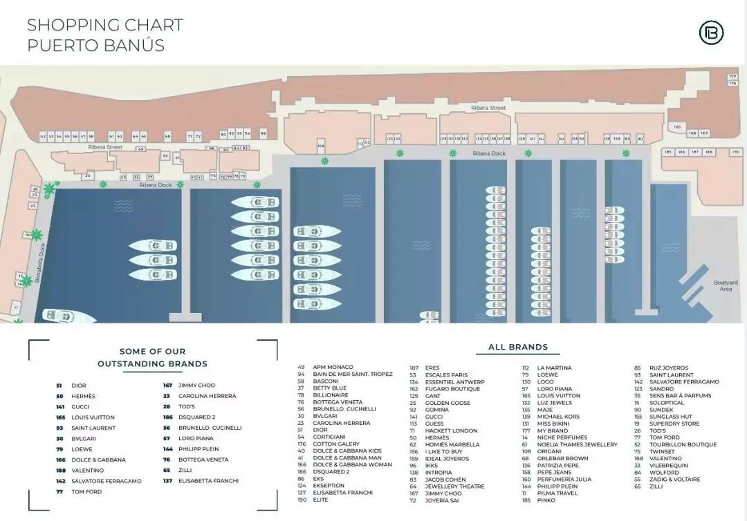 顶级品牌多,是奢侈品购物的天堂。港区内有200多家商店,包括世界各大知名品牌店铺:芬迪(Fendi)、杜嘉班纳(Dolce Gabbana)、洛罗·皮亚纳(Loro Piana)和路易威登(Louis Vuitton)等100多家国际门店已经扩大了门店面积。还有宝格丽(Bvlgari)、劳力士(Rolex)、迪奥(Dior)、爱马仕(Hermes)、洛威(Loewe)、圣罗兰(Saint Laurent)、卡罗琳娜·埃雷拉(Carolina Herrera)和华伦天奴(Valentino)……满足名流的购物需求。